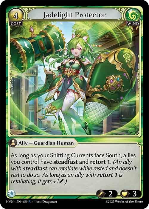 As long as your Shifting Currents face South, allies you control have steadfast and retort 1. (An ally with steadfast can retaliate while rested and doesn't rest to do so. As long as an ally with retort 1 is retaliating, it gets +1 power.)