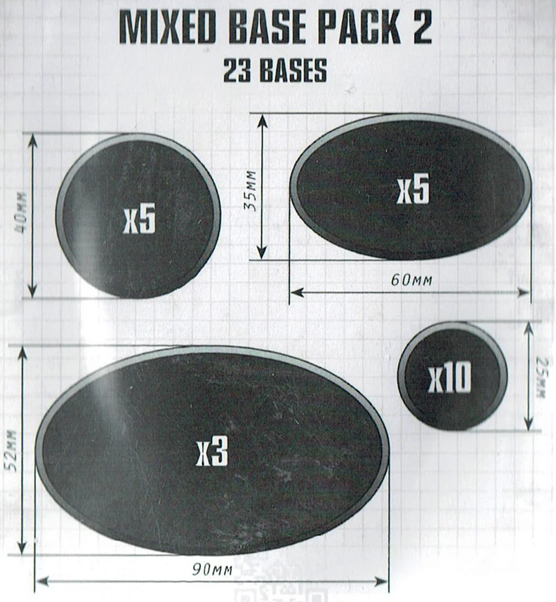 This set contains 10 plastic 25mm Round Bases, 5 40mm Round Bases , 3 90mmx52mm Oval Bases and 5 60mmx35mm Oval Bases.