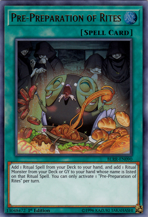 Add 1 Ritual Spell Card from your Deck to your hand, and add 1 Ritual Monster from your Deck or Graveyard to your hand whose name is listed on that Ritual Spell Card. You can only activate 1 "Pre-Preparation of Rites" per turn.