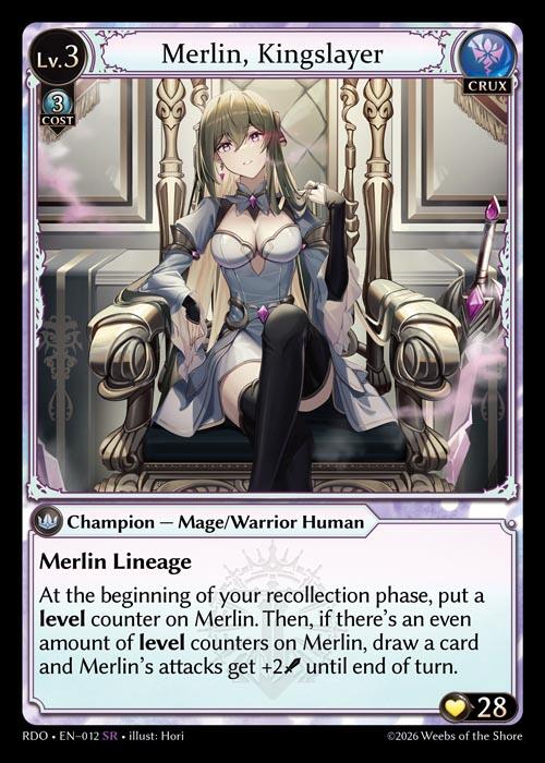 At the beginning of your recollection phase, put a level counter on Merlin. Then, if there's an even amount of level counters on Merlin, draw a card and Merlin's attacks get +2 Power until end of turn.